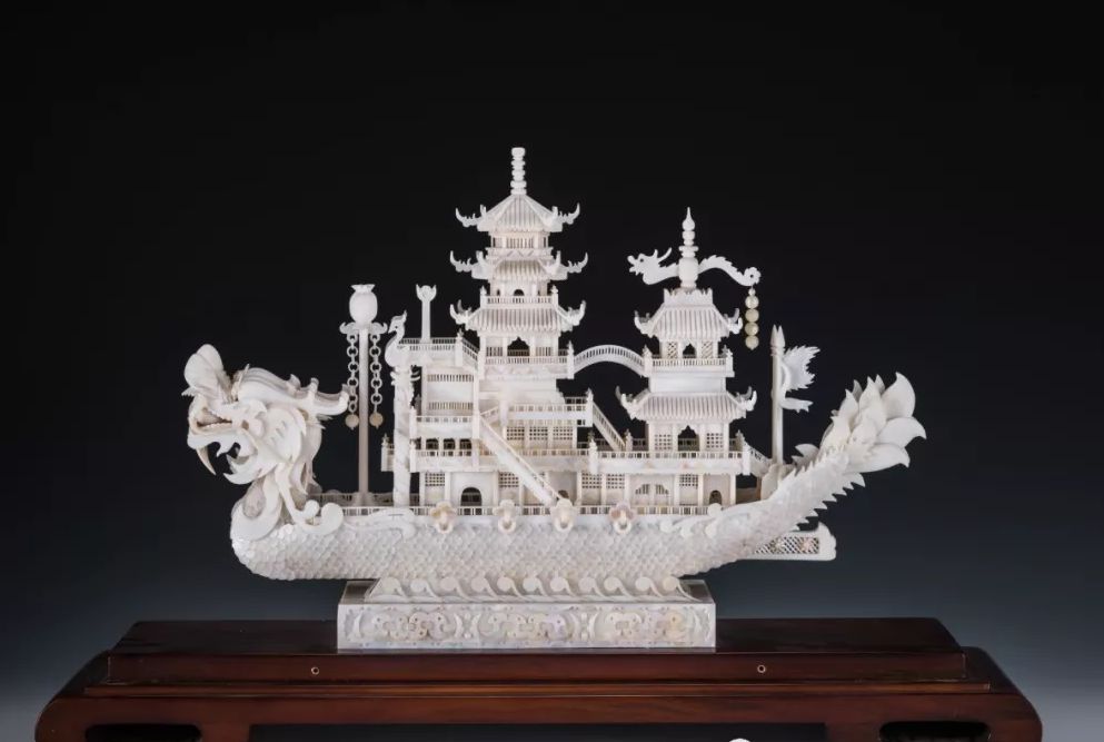 《雪精龍舟》為路光榮大師“淡水貝立體貝雕工藝品系列”的代表作之一,“雪精龍舟”是納西族七星披肩的民間傳說(shuō)。作者將龍舟、宮殿、園林、亭閣等融于一體,船頭為兩個(gè)昂首向前的龍頭,龍首昂起含珠,有飛騰之感,好似龍舟在波濤中乘長(zhǎng)風(fēng)破萬(wàn)里浪,生動(dòng)而自然。龍舟上有五至七層的亭臺(tái)樓閣高低參差,長(zhǎng)廊走道迂回曲折,桅桿高高聳立。整個(gè)作品透體潔白晶瑩,恰似“雪精”,布局錯(cuò)落有致,結(jié)構(gòu)完整,氣勢(shì)宏偉。精細(xì)的鏤空亭閣更顯現(xiàn)出作者精湛的雕刻與鑲嵌工藝。
